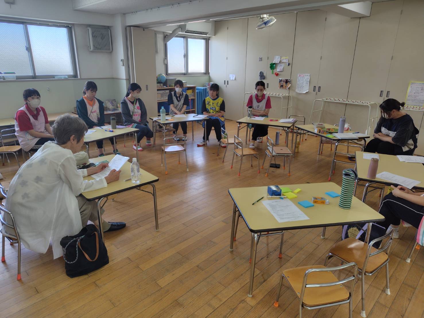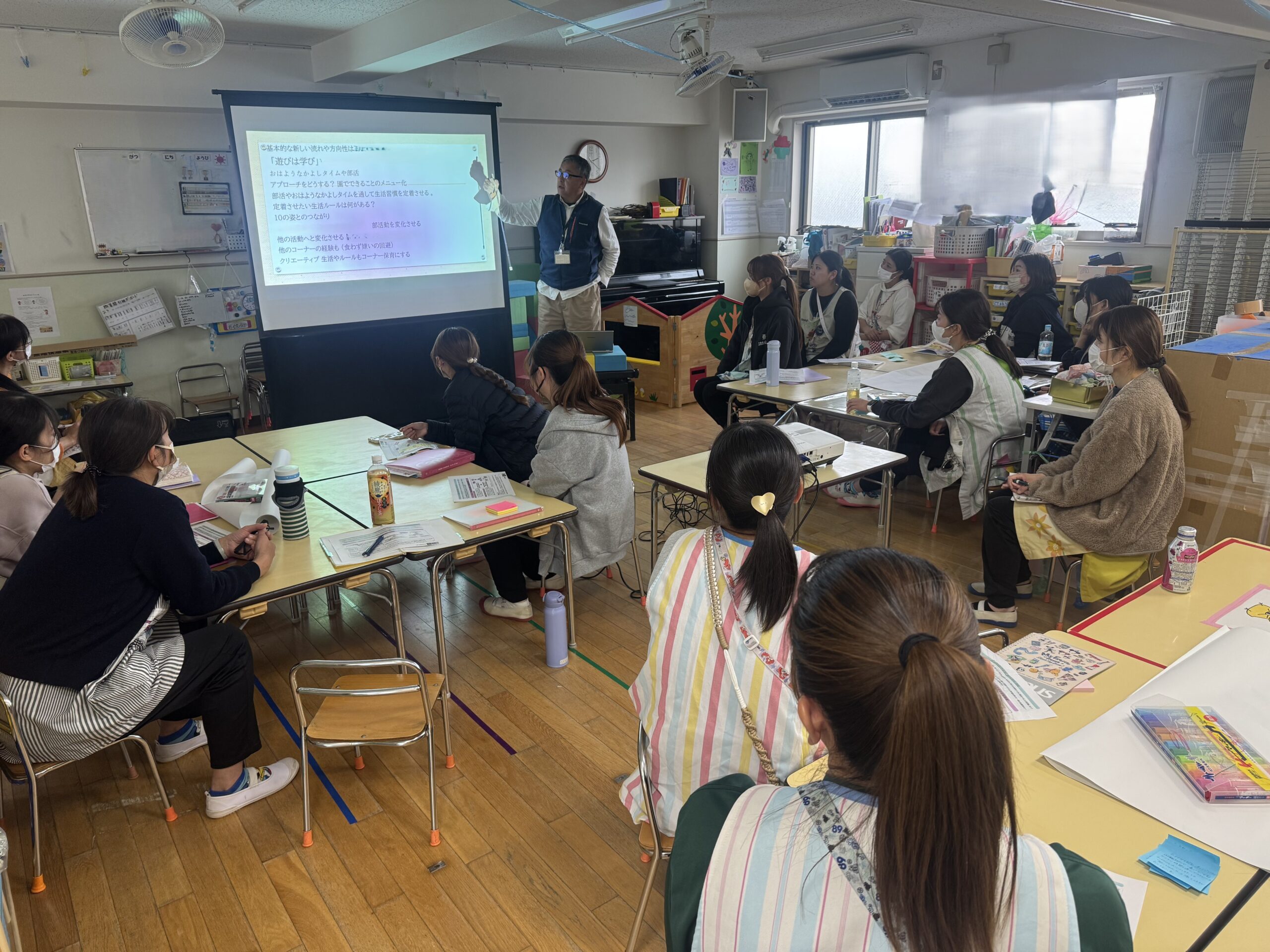 みんなで集まり、園内研修を行うこともあります!お互いを肯定的に受け入れること、「いいね」をする、リスペクトをするような関係が出来上がっていきます。